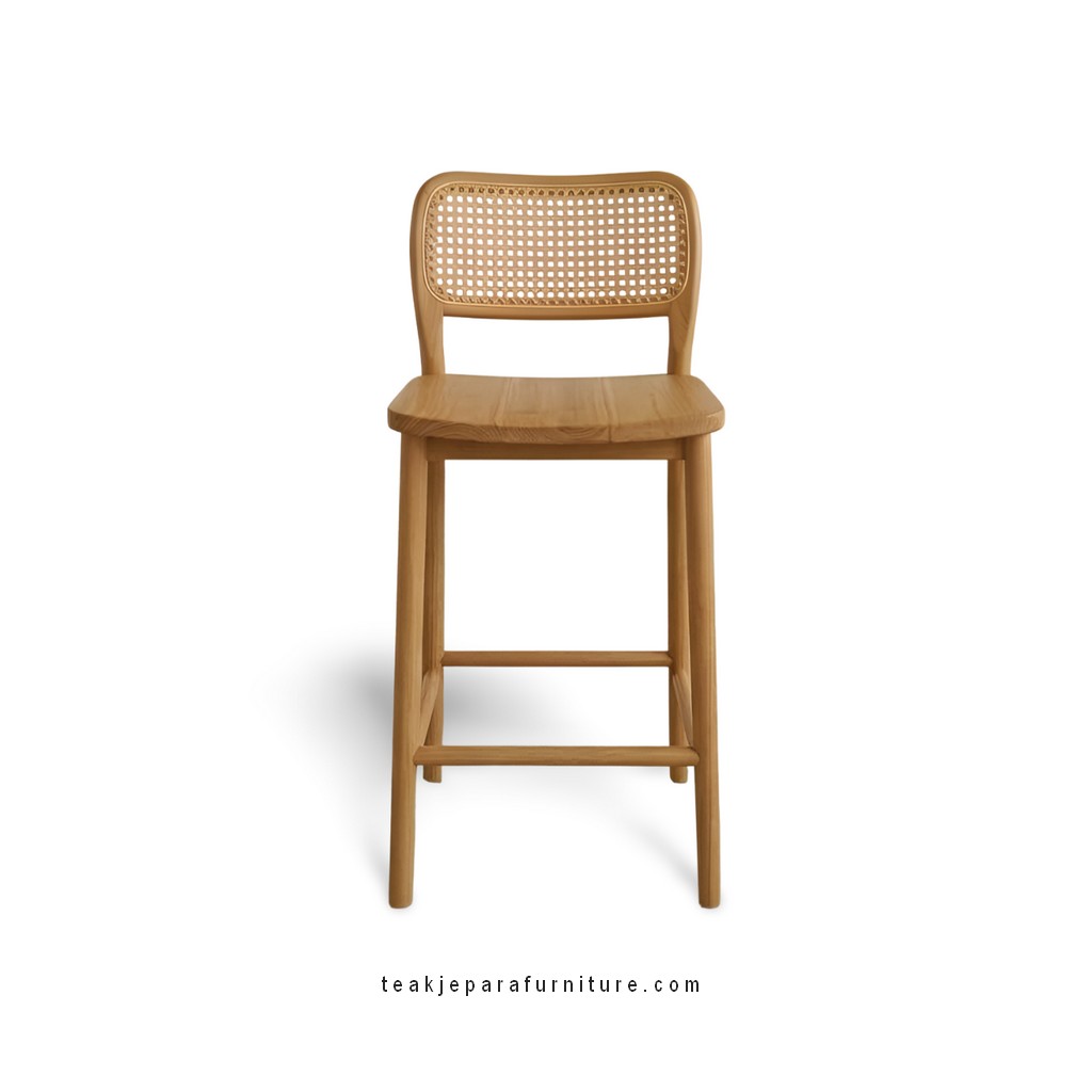 This solid teak and rattan bar stool was made by hand and has woven details and a high-quality comfort seating design