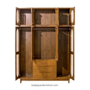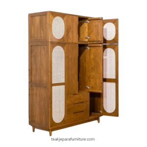 Solid wood is more than simply a choice of material. It is a sustained dedication to excellence. Solid wood retains screws securely, resists warping, and improves with age, in contrast to MDF or particle board. For wardrobe frames, teak, oak, walnut, and acacia are popular options. Every species has a unique color tone and grain pattern. The outcome is a wardrobe that seems purposeful and natural when combined with hand-woven rattan panels on the side panels or doors. Because of the rattan weaving, air can flow freely throughout the closet, preventing moisture accumulation and preserving the freshness of your clothes. When evaluating furniture alternatives, most individuals fail to consider this useful advantage.